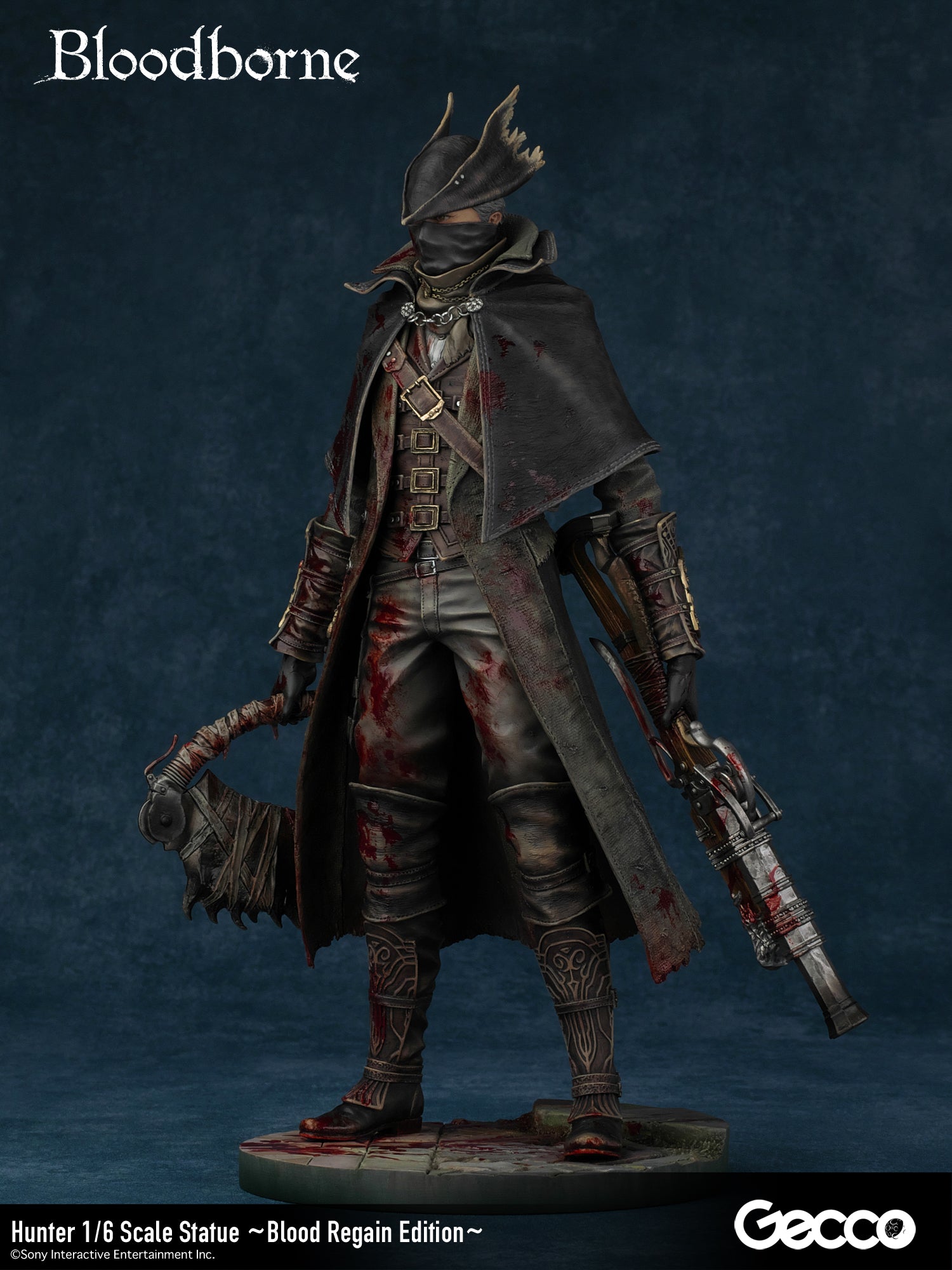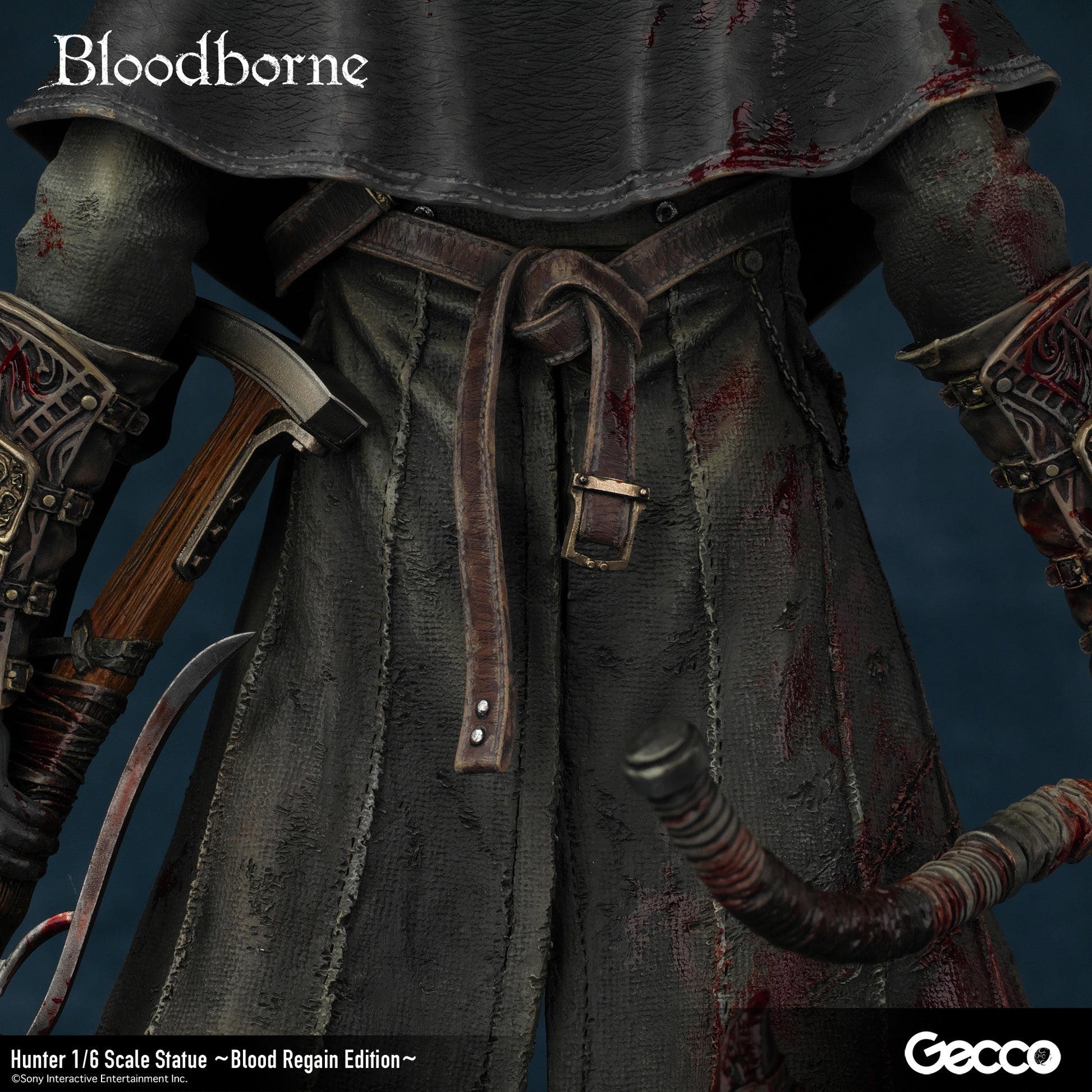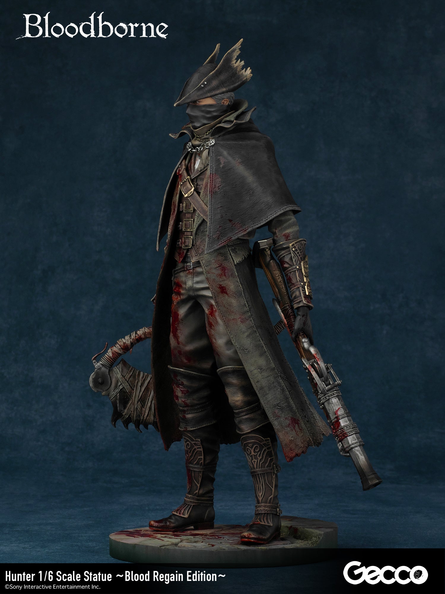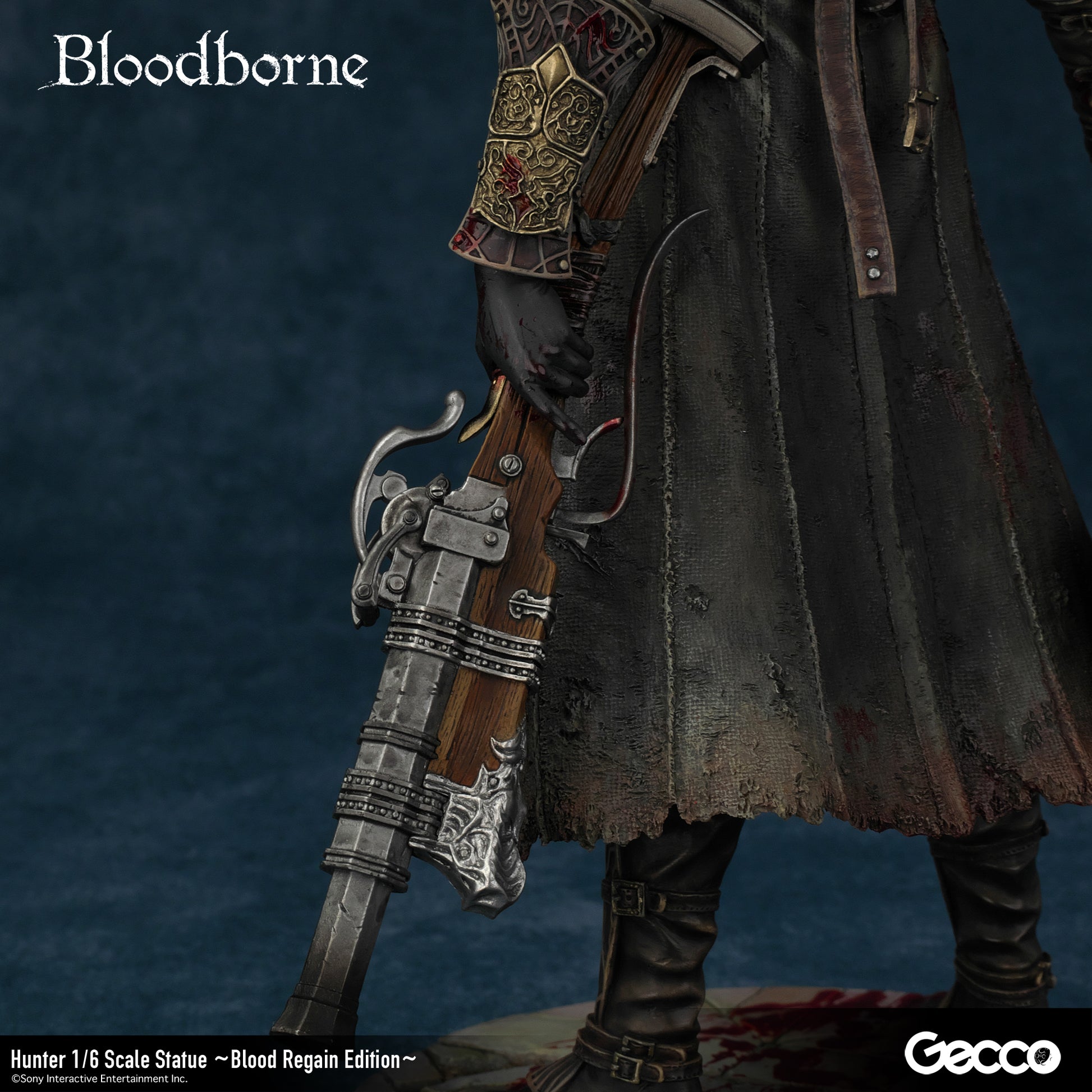 DetailsSculptor: Shinya Akao (HEADLONG) Digital Sculptor (weapons): Masaki Akao (HEADLONG), Yuki Watanabe (G-tempest) Painter: Katsushige Akiyama (-accent-)The basic equipment of The Old Hunters version hunter (sold separately) released in 2018 was changed to a sawed-off machete and a beast-hunting shotgun.In addition, a beast-hunting axe, short rifle, torch, cannon, and church stone hammer are added to this luxurious version.The "Blood Regain Edition," which is bathed in the blood of returning enemies, strongly expresses the game concept of Bloodborne, in which attack is the best defense.The figure can be combined with a right-hand weapon, a left-hand firearm, and even in a transformed state for a variety of display options.The face part features the expression of a young hunter who has come to the ancient city of Yanam to seek medical treatment for his blood, and his wolf-like amber eyes are very impressive.The pedestal is newly sculpted in the motif of the underground passage of the Holy Grail dungeon.