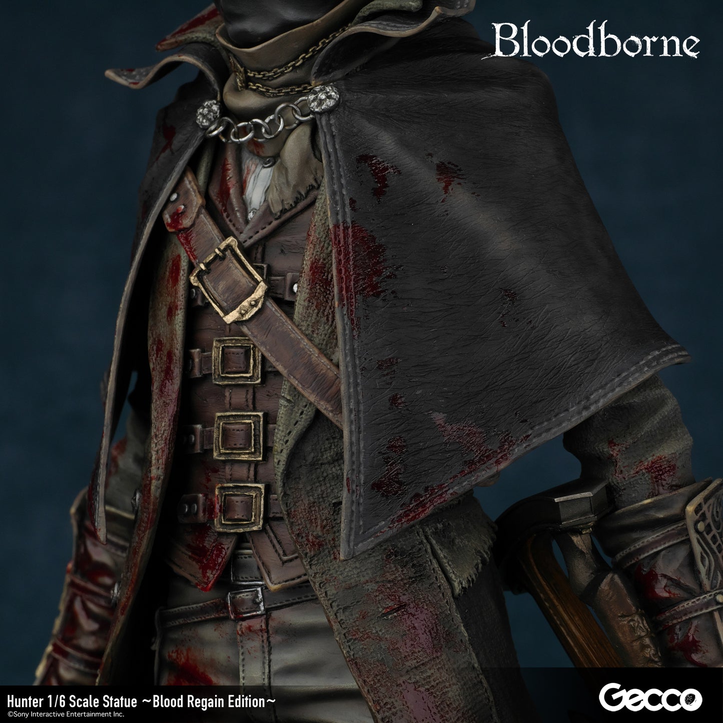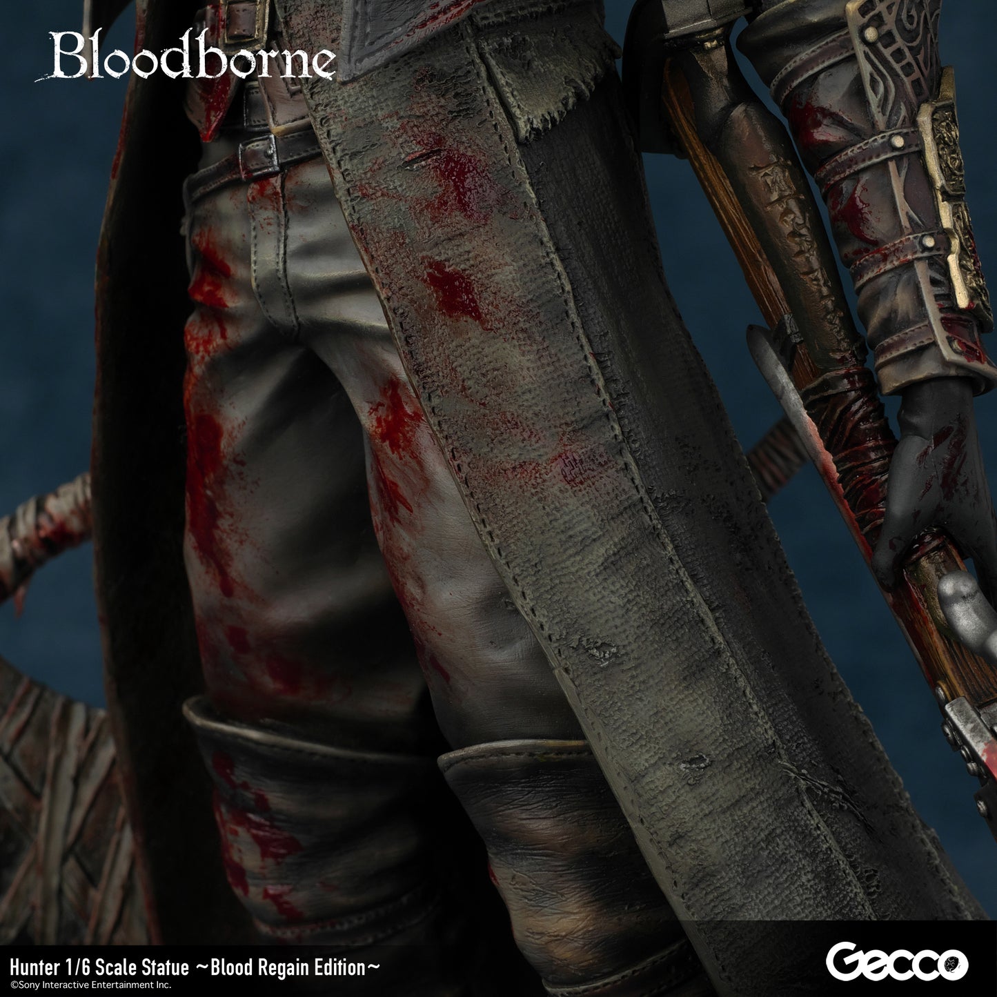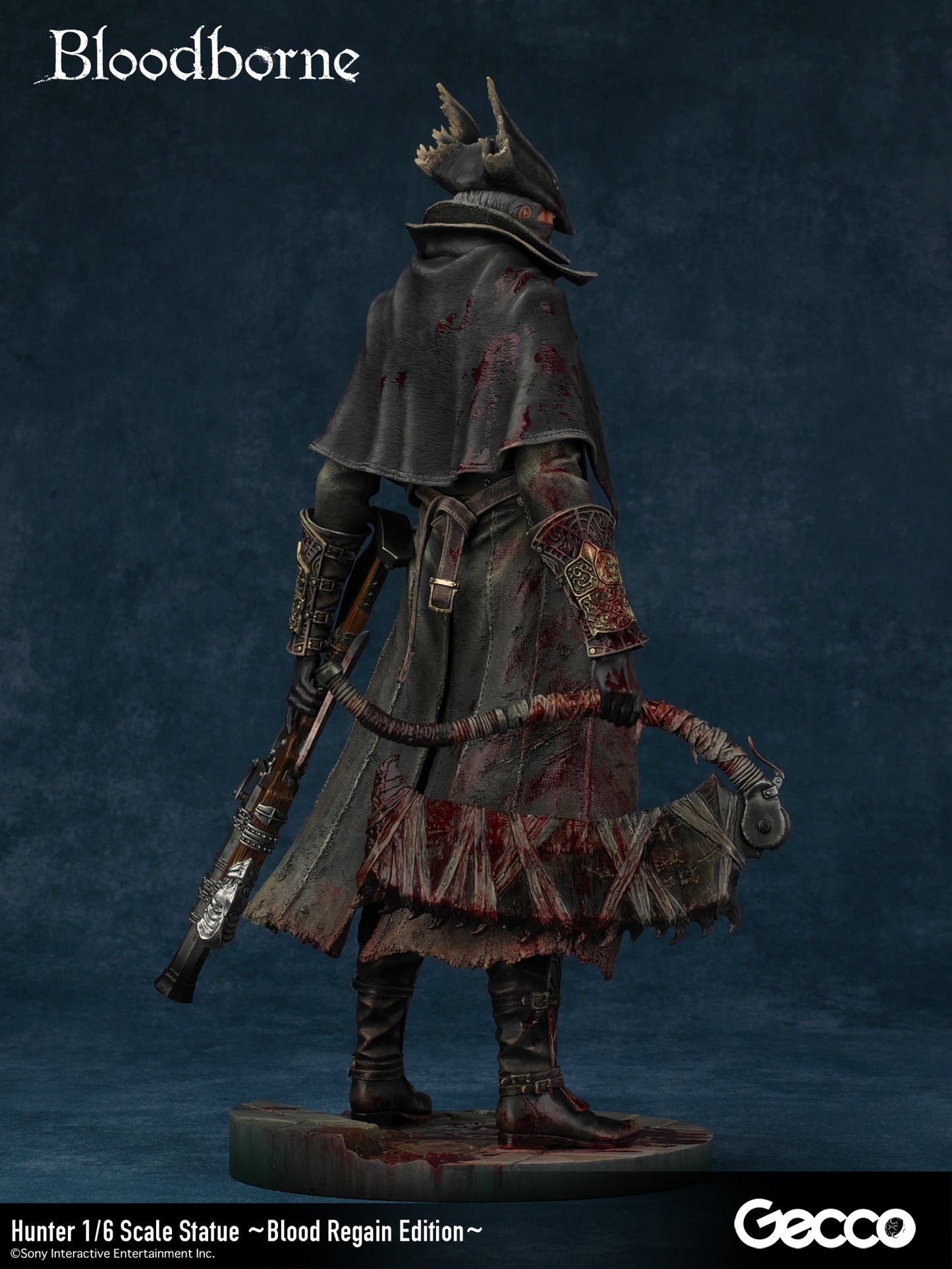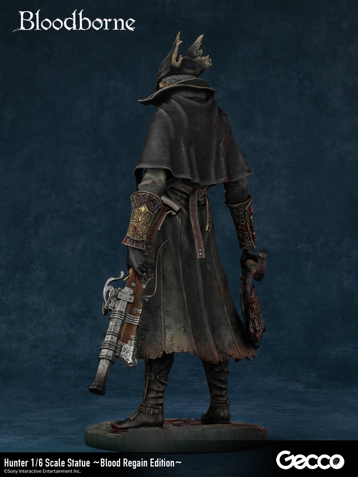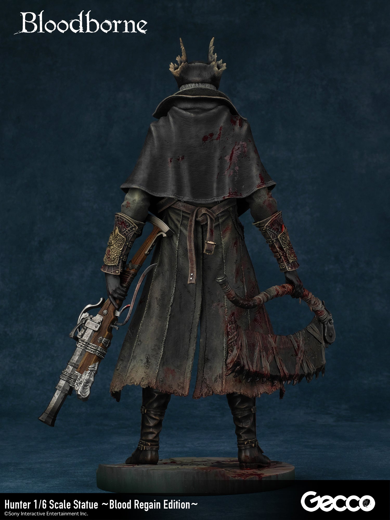 DetailsSculptor: Shinya Akao (HEADLONG) Digital Sculptor (weapons): Masaki Akao (HEADLONG), Yuki Watanabe (G-tempest) Painter: Katsushige Akiyama (-accent-)The basic equipment of The Old Hunters version hunter (sold separately) released in 2018 was changed to a sawed-off machete and a beast-hunting shotgun.In addition, a beast-hunting axe, short rifle, torch, cannon, and church stone hammer are added to this luxurious version.The "Blood Regain Edition," which is bathed in the blood of returning enemies, strongly expresses the game concept of Bloodborne, in which attack is the best defense.The figure can be combined with a right-hand weapon, a left-hand firearm, and even in a transformed state for a variety of display options.The face part features the expression of a young hunter who has come to the ancient city of Yanam to seek medical treatment for his blood, and his wolf-like amber eyes are very impressive.The pedestal is newly sculpted in the motif of the underground passage of the Holy Grail dungeon.